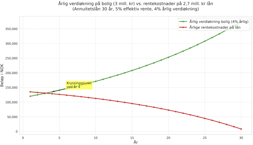 Et annen ting som er verdt å nevne er at boligens økning på 4% årlig vil utgjøre mer enn 5% renter på lånet etter 4 år (gitt 30-års annuitetslån). Kortere lån betyr at dette inntreffer tidligere.