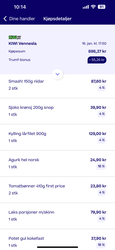 Dette bildet viser min siste handletur på kiwi på en Trippel-Trumf Torsdag. Omtrent 900 kroner brukt, 55 kroner spart. I Desember var der to Trippel-Trumf Torsdager. Jeg handlet på i Trumf-butikker for 3200 kroner, og fikk 124 kroner i bonus.